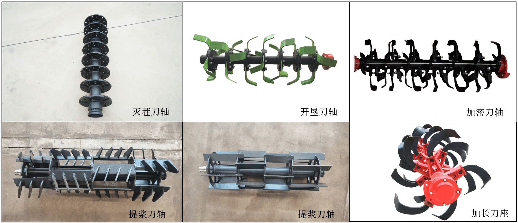 可根據(jù)水旱田及農(nóng)藝需要配制:滅茬刀軸、開墾刀軸、加密刀軸、提漿刀軸、加長刀座