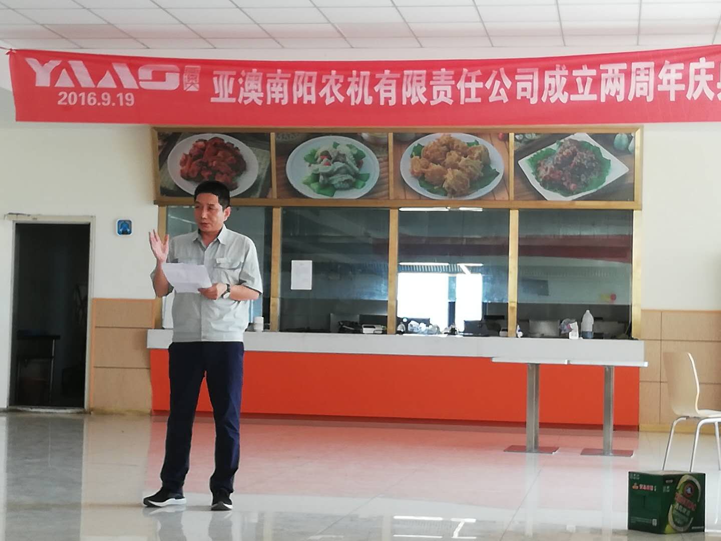中秋佳節(jié)至,周年慶歡喜。2018年9月23日,亞澳南陽農(nóng)機(jī)有限責(zé)任公司開業(yè)兩周年慶典暨歡度中秋佳節(jié)活動(dòng)在公司餐廳隆重舉行,因當(dāng)天有生產(chǎn)任務(wù),在不耽誤生產(chǎn)及各部門班組的全力配合下,慶典活動(dòng)在中午12:00順利開始。