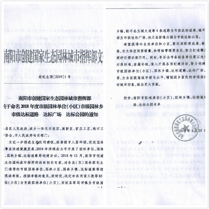 此次我公司喜獲 “南陽(yáng)市園林式單位”的榮譽(yù)稱(chēng)號(hào),是市級(jí)主管部門(mén)對(duì)我公司優(yōu)美的綠色生態(tài)環(huán)境和園林綠化建設(shè)維護(hù)工作的高度肯定。我們會(huì)以此為新起點(diǎn),不斷加強(qiáng)生態(tài)環(huán)境建設(shè)和綠化養(yǎng)護(hù)管理工作,使廠區(qū)綠化特色更加顯現(xiàn),廠區(qū)綠化品位更上檔次,打造出更加優(yōu)美的生態(tài)園林廠區(qū)環(huán)境,為“國(guó)家綠色工廠”做好基礎(chǔ)。