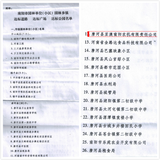 近日,南陽(yáng)市公布了2018年度全市園林式居住區(qū)(單位)評(píng)選結(jié)果,亞澳南陽(yáng)農(nóng)機(jī)有限責(zé)任公司榜上有名,榮獲市級(jí)“園林式單位”榮譽(yù)稱(chēng)號(hào)。