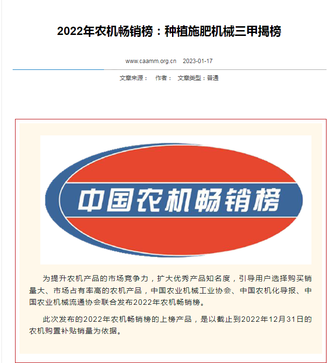 據(jù)中國(guó)農(nóng)機(jī)網(wǎng)最新消息,為提升農(nóng)機(jī)產(chǎn)品的市場(chǎng)競(jìng)爭(zhēng)力,擴(kuò)大優(yōu)秀產(chǎn)品知名度,引導(dǎo)用戶選擇購(gòu)買(mǎi)銷(xiāo)量大、市場(chǎng)占有率高的農(nóng)機(jī)產(chǎn)品,中國(guó)農(nóng)業(yè)機(jī)械工業(yè)協(xié)會(huì)、中國(guó)農(nóng)機(jī)化導(dǎo)報(bào)、中國(guó)農(nóng)業(yè)機(jī)械流通協(xié)會(huì)聯(lián)合發(fā)布2022年農(nóng)機(jī)暢銷(xiāo)榜。亞澳農(nóng)機(jī)進(jìn)入耕整地機(jī)械和種植施肥機(jī)械農(nóng)機(jī)暢銷(xiāo)雙料三甲榜。