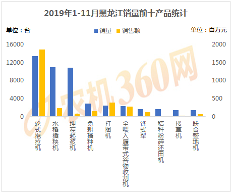 2019年1-11月,上榜黑龍江用戶購機量前十的農(nóng)機產(chǎn)品如下圖所示,輪式拖拉機、水稻插秧機、埋茬起漿機等10種農(nóng)機合計購買力4.9萬臺,是黑龍江農(nóng)機銷量的93.09%,對這10類農(nóng)機的購機支出達32.23億元。